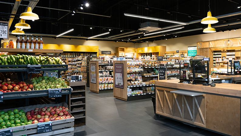- Un concept moderne et chaleureux : des vitrines et façades ouvertes et accueillantes, un mobilier à échelle humaine écoresponsable facilitant la visibilité, un éclairage chaleureux, un balisage complet et modulable, une palette de couleurs harmonieuses et douces.